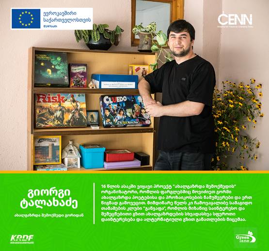 Giorgi lives in Gori and, since childhood, has actively been involved in voluntary work. His interests are diverse and the majority of them are related to youth and community development. From 2021, Giorgi created a board game club “Ganjafa” to provide education to youth in an alternative way; Board game club successfully hosts people enjoying similar youth activities.