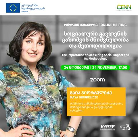 CENN, ევროკავშირის მხარდაჭერითა და არასამთავრობო ორგანიზაცია Green Lane-თან პარტნიორობით, ნოემბრის თვეში არსებული სამეწარმეო დღეების აღნიშვნასთან დაკავშირებით, 24 ნოემბერს უმასპინძლებს რეგიონულ შეხვედრას თემაზე - სოციალური გავლენის გაზომვის მნიშვნელობა და მეთოდოლოგია.
