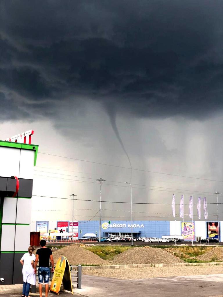 В воскресенье в Майкопе и его окрестностях прошел сильный дождь с грозой, градом и шквальным ветром, А на северо-западной окраине Майкопа очевидцы засняли смерч, довольно редкое для нашей местности явление природы.