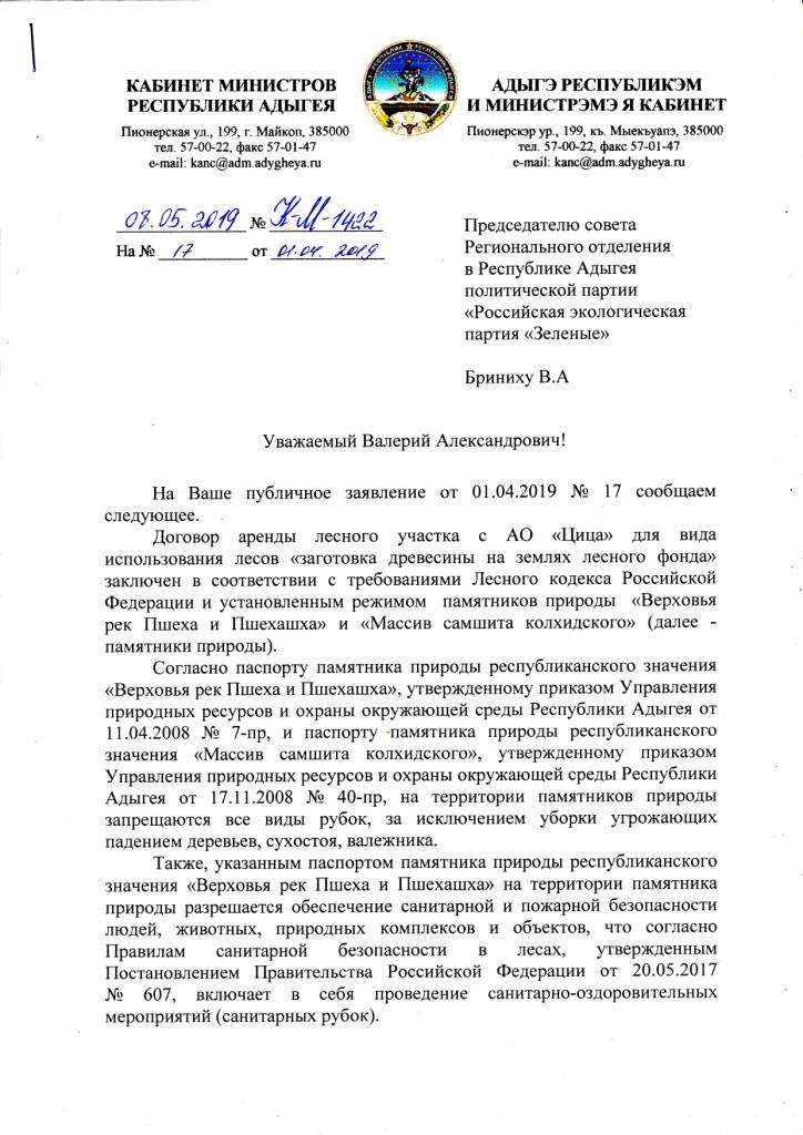Чем же меня так расстроил глава Кабинета Министров Республики Адыгея? Наролин дал официальный ответ на публичное заявление Регионального отделения в Республике Адыгея политической партии «Российская экологическая партия «Зеленые», принятое Советом РО партии и распространенное 1 апреля 2019 года. В нем мы, «зеленые», выразили свою позицию по поводу масштабных незаконных (под видом санитарных) рубок леса в памятниках природы, в т.ч. в границах объекта Всемирного природного наследия «Западный Кавказ», на территории лесного фонда Цицинского участкового лесничества Майкопского лесничества Управления лесами Республики Адыгея. В этом публичном заявлении, которое я публиковал в Фейсбуке и в рассылках, говорится также и о коррупционных схемах заготовки и реализации под видом дровяной древесины якобы погибших деревьев (в памятниках природы можно убирать только сухостой и валежник) тысяч кубометров полноценной деловой древесины здоровых сырорастущих деревьев дуба, бука, пихты, клена, ясеня, липы и граба Причем с диаметрами ствола на высоте груди не менее 30-40 см, а многие пни достигают диаметра до 1,5 метров. Понятно, что разница в цене дровяной и деловой древесины кратна 10 и более раз. Отсюда и баснословные неучтенные прибыли, расходящиеся, вместо пополнения бюджета, по карманам лесозаготовителей и их высокопоставленных покровителей, многочисленных проверяющих из надзорных и правоохранительных органов.