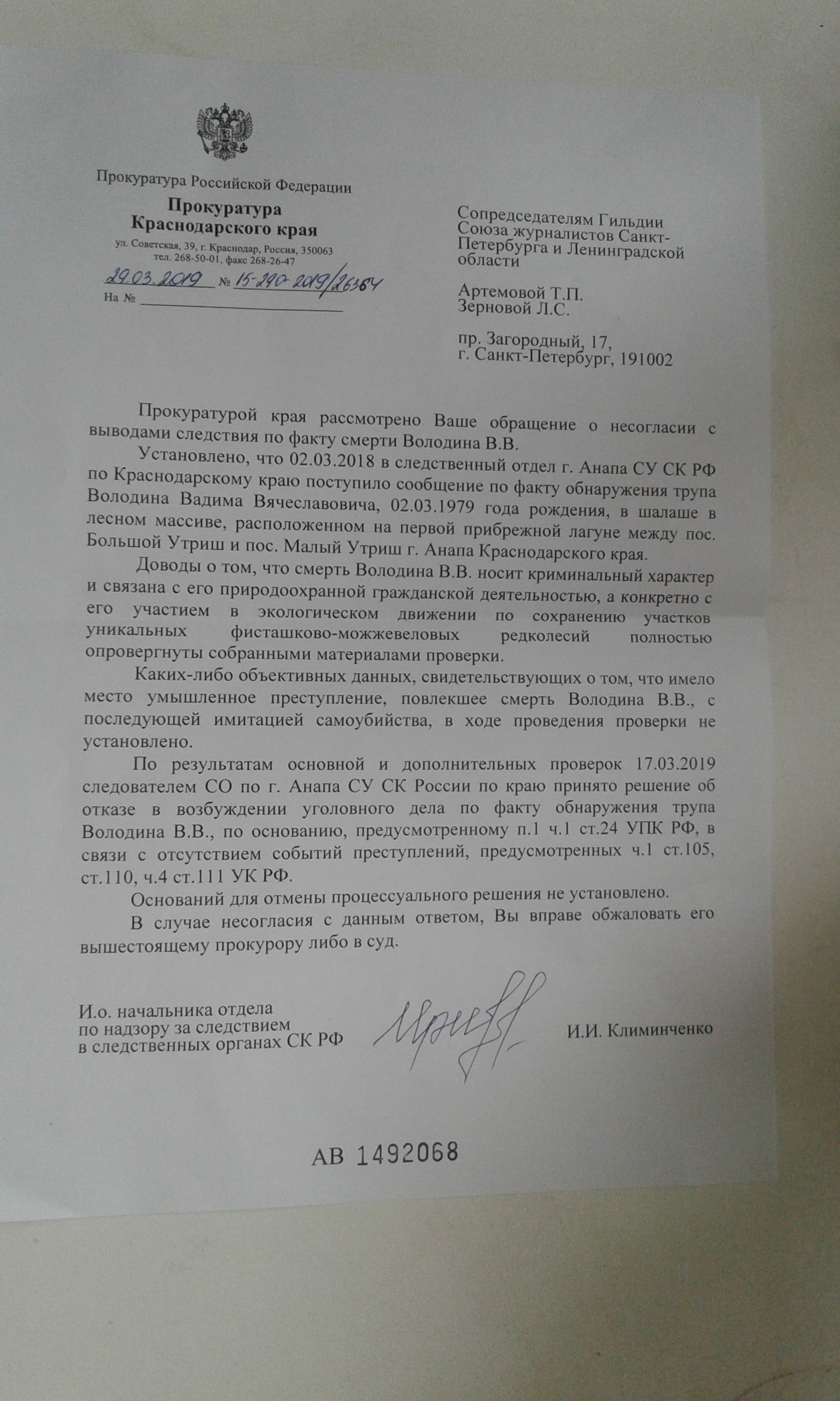 Subject: Ответ Прокуратуры по Обращению в защиту Утриша