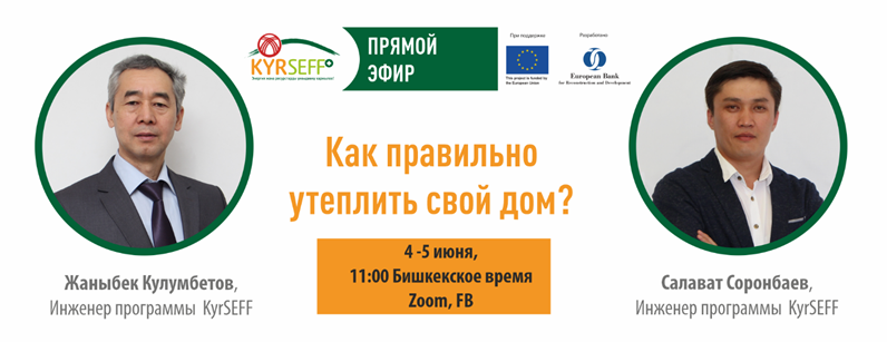 Программа финансирования устойчивой энергии в Кыргызстане - (KyrSEFF) при поддержке Европейского Банка реконструкции и развития (ЕБРР) и Европейского Союза (ЕС) 4 и 5 июня приглашает Вас принять участие в вебинаре: «Как правильно утеплить свой дом? Практические советы специалистов KyrSEFF».