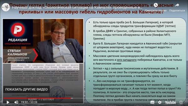 Докладчик явно скороговоркой упомянул про ролик в Yotube-канале, в котором декан химфака МГУ говорил об обнаружении в пробе из бухты Большая Лагерная следов распада ракетного топлива. О том, исследовали ли ДВФУ и еще 11 организаций, проводивших анализ проб, наличие гептила и продуктов его распада? Если да, то где и когда брали пробы, какие результаты анализов? Об этом ни слова.