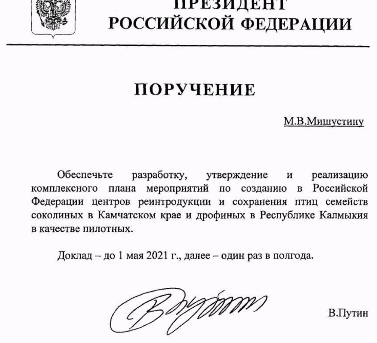 Владимир Путин поручил Михаилу Мишустину начать большую работу по созданию в РФ системы центров реинтродукции и сохранения птиц. Пилотными станут объекты для семейства соколиных в Камчатском крае и дрофиных в Калмыкии.