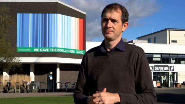 "Полоски потепления" (Warming Stripes, на фото - на стене здания) изобрели