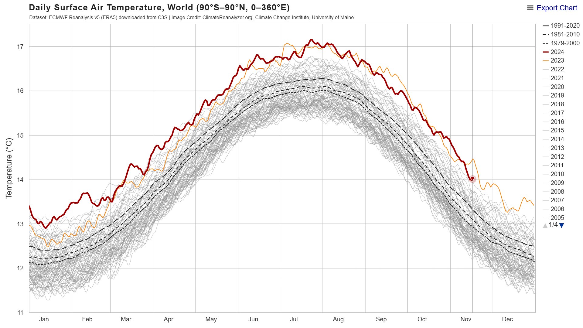 Sixteen of the last seventeen months have set or effectively tied the monthly global temperature record, with only September 2024 serving as an exception. In addition, October 2024 marks the sixteenth consecutive month at least 1.5 °C warmer than the corresponding 1850 to 1900 monthly average.