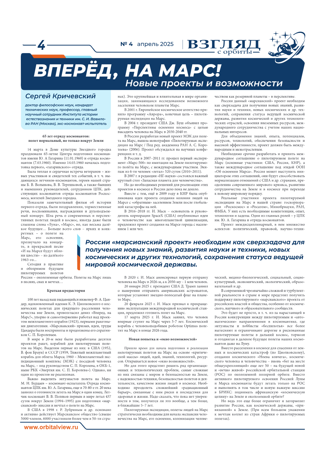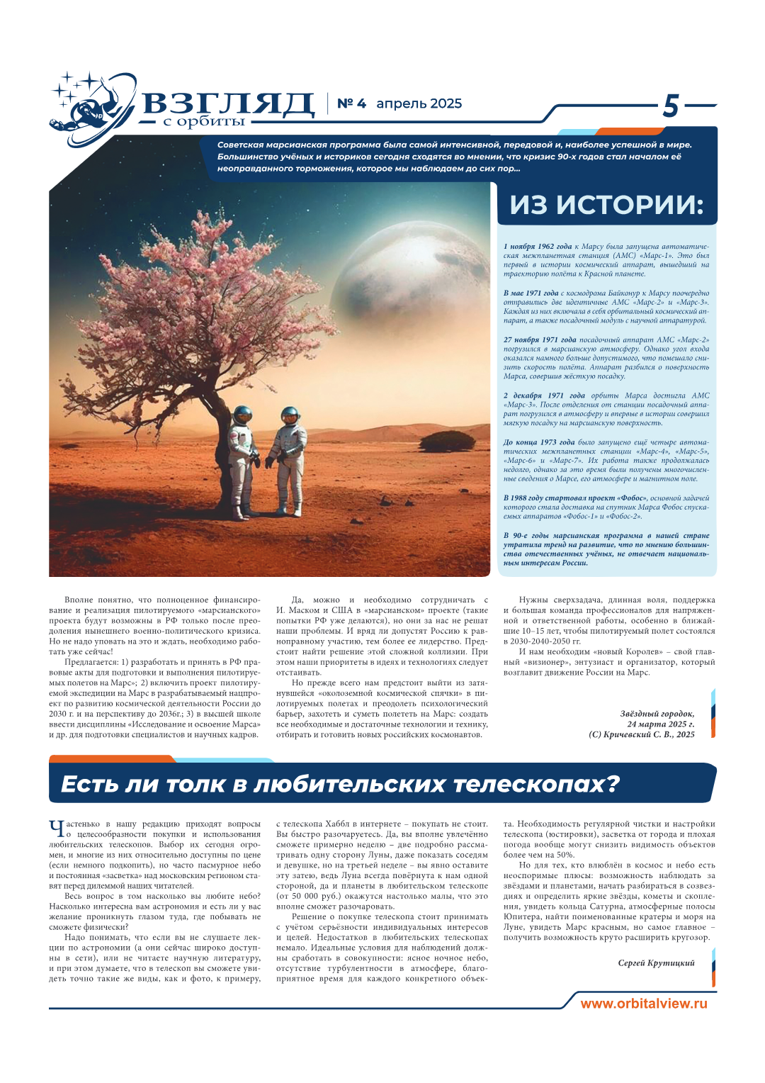 Subject: Кричевский С. Вперёд, на Марс! Новые проекты и возможности // Взгляд с орбиты. №4. апрель 2025. C.4-5.