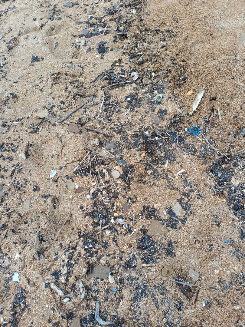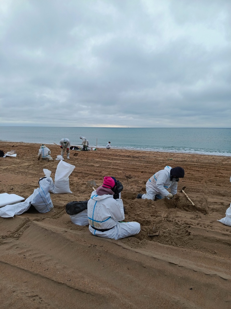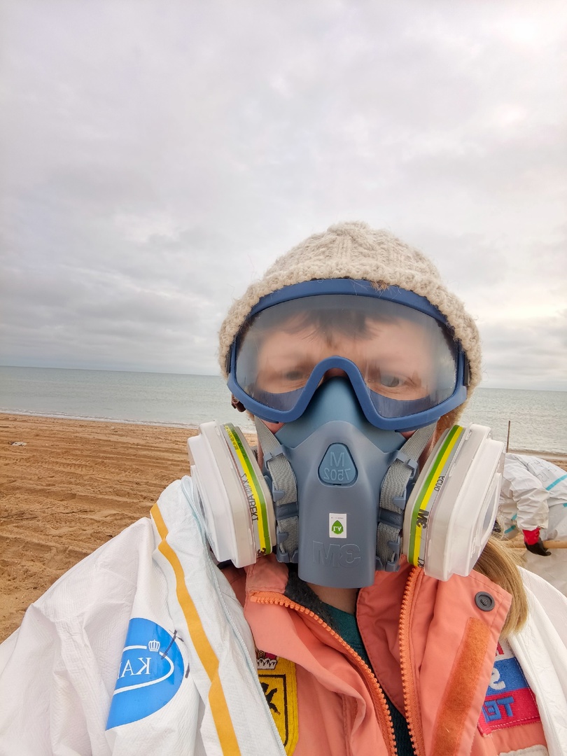 Уехали на Бугазскую косу, в самую... даль. Здесь жизнеобеспечением занимается штаб "Шлагбаум", такой очень молодежный и движовый штаб. Выдали СИЗ, отвезли на косу, там пляж, сама коса и лиман. Пляж со стороны моря покрыт мелкими кусочками мазута. Если копнуть лопатой, там еще прослойка мазута. Ранние выбросы не убрали, штормом сверху намыло песка сантиметров 20, да ещё и всё перемешало.
