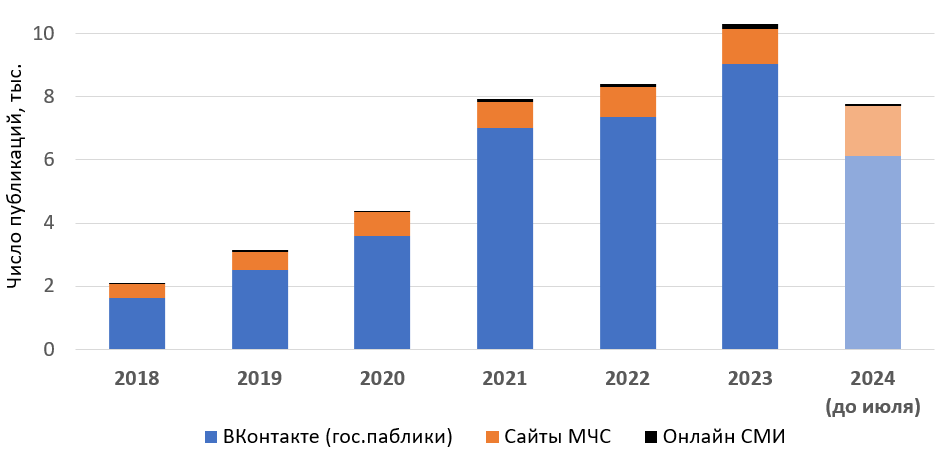 Рис. 1. Число новостных публикаций об опасных природных явлениях растет с каждым годом, в первую очередь в соцсетях: органы местного самоуправления переходят в онлайн, где предупреждают жителей о плохой погоде, рассказывают о принимаемых мерах реагирования или оповещают о полагающейся помощи пострадавшим.