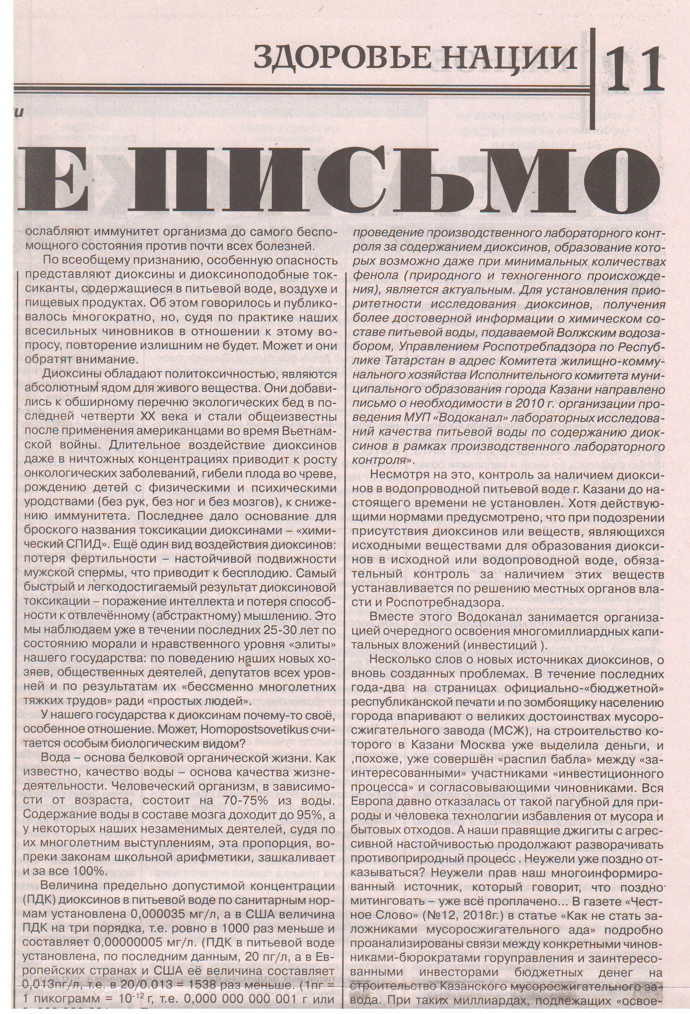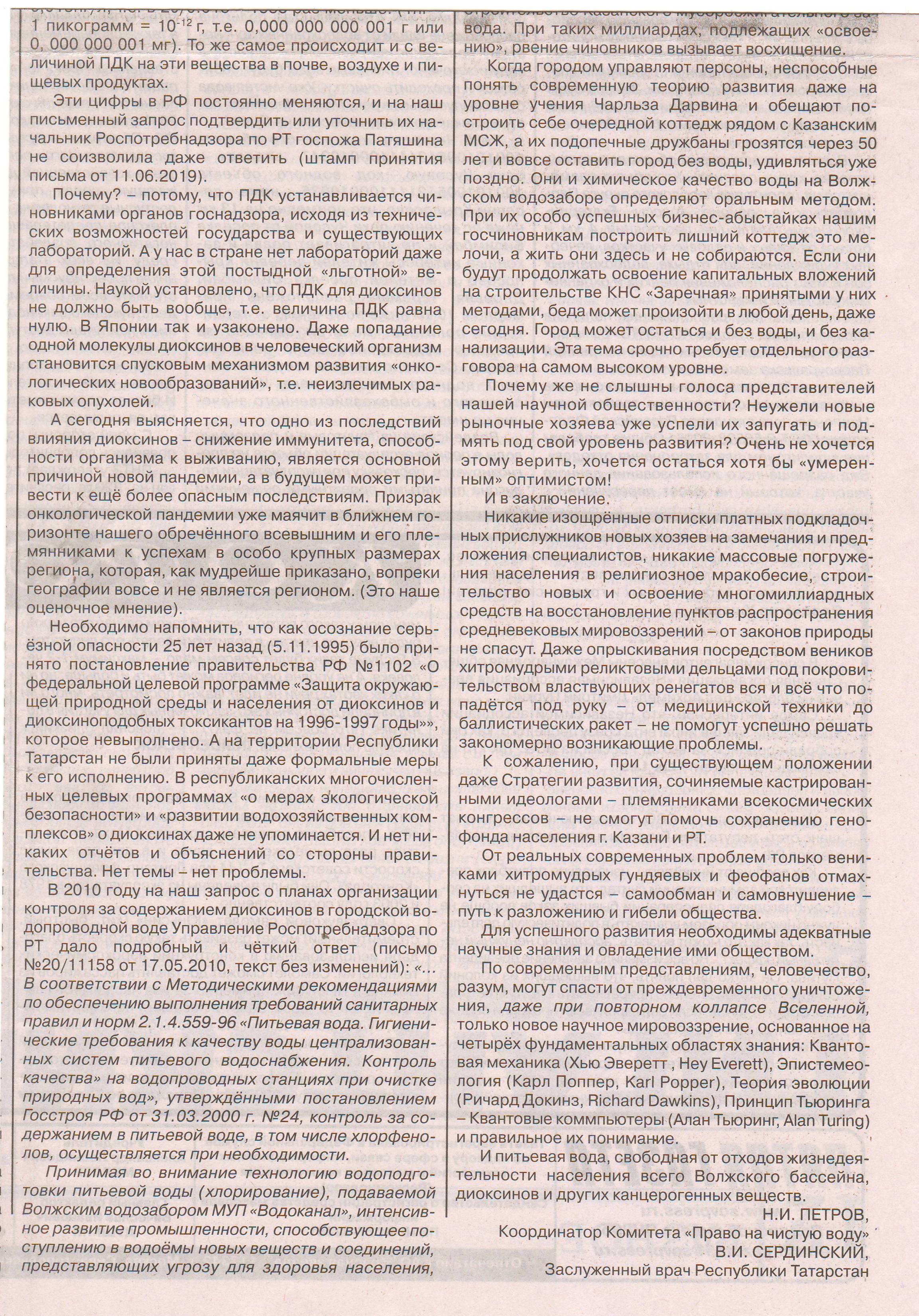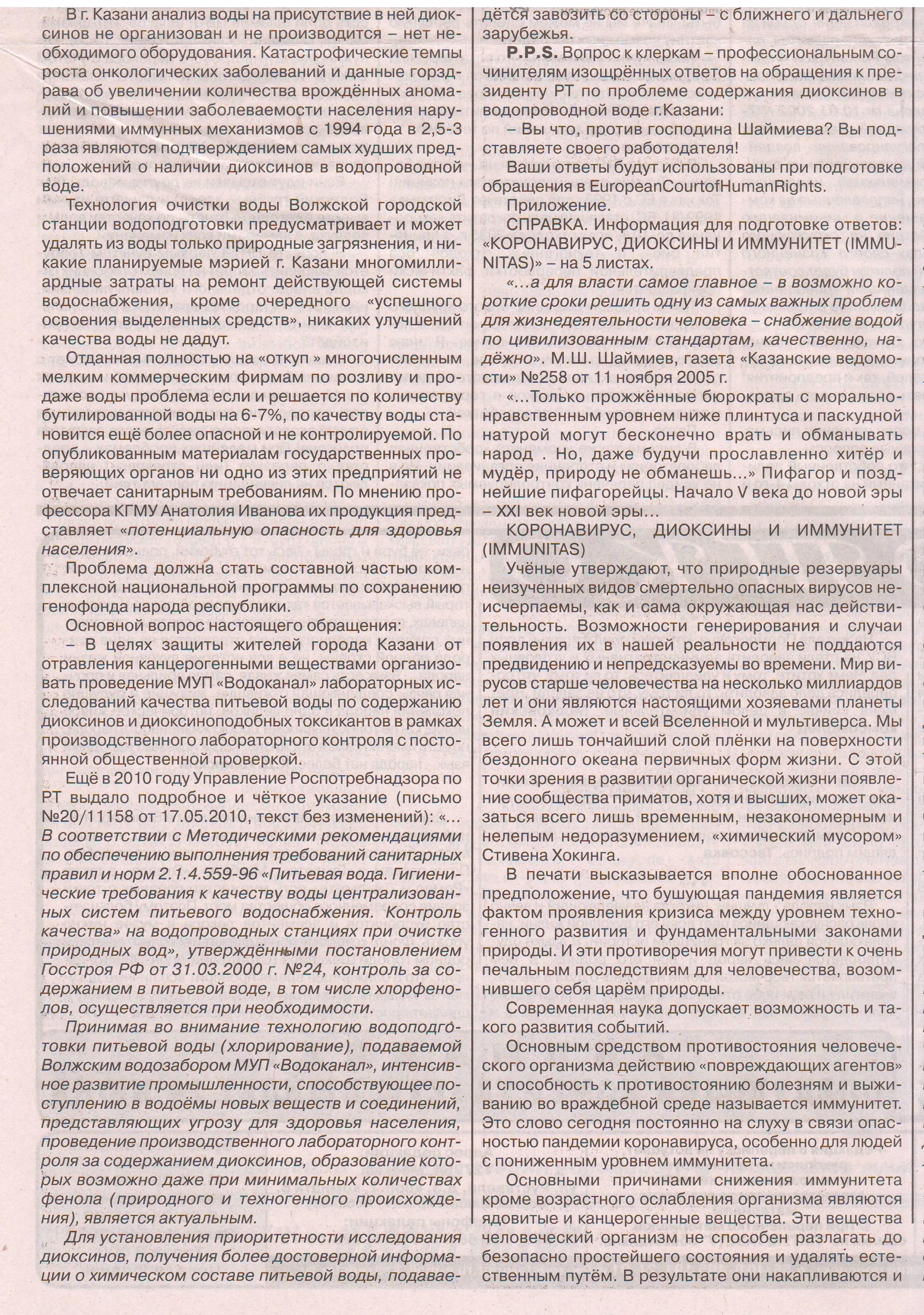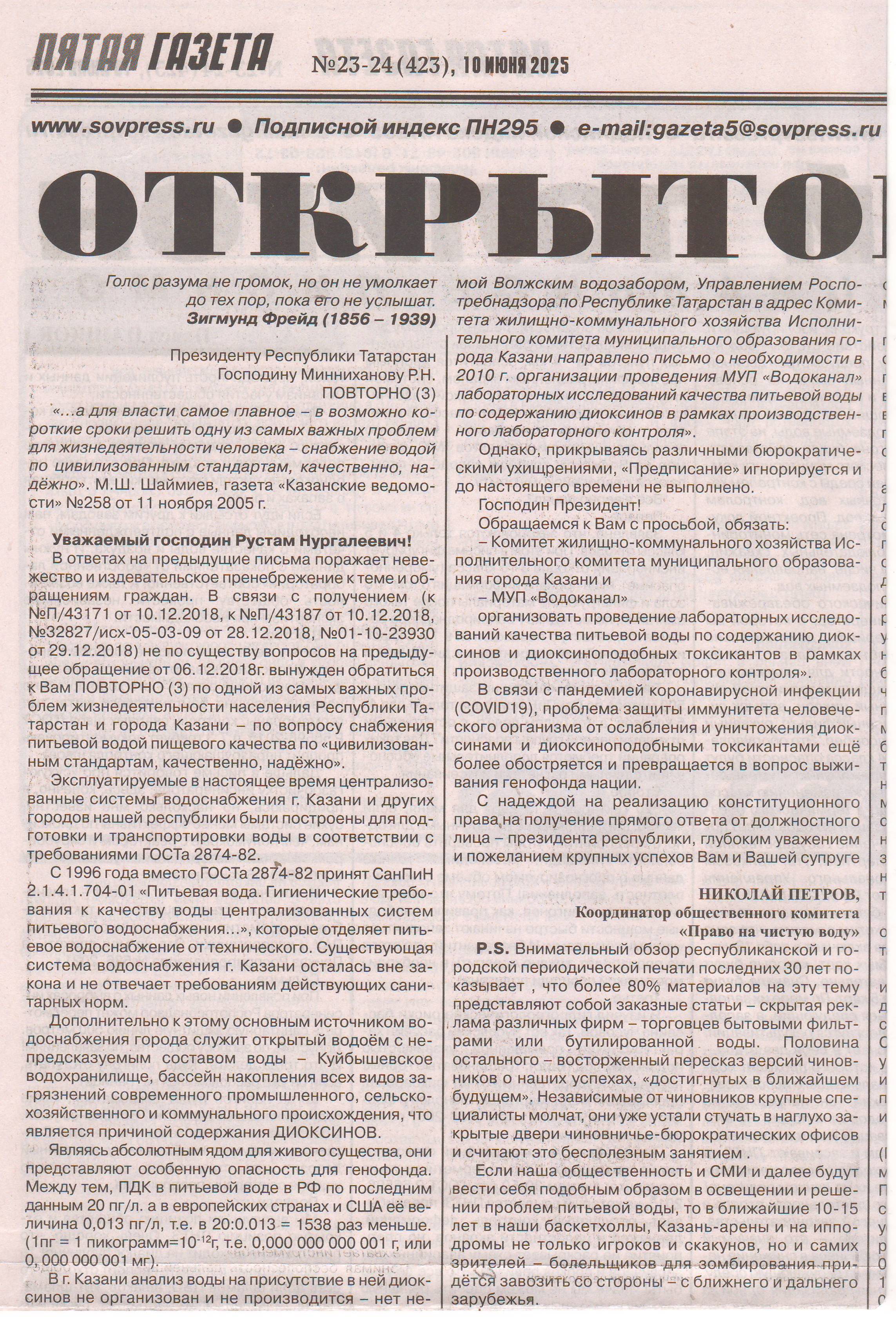 Также шлю 4 файла статьи в «Пятой газете» от 10 июня 2025г – Открытое письмо, в которой авторы Петров Н.И. и Сердинский В.И. рассказывают о экологическом состояние водоснабжения населения Казани питьевой водой, о диоксинах содержащих в водопроводной воде. Открытое письмо направлено главе Республики Татарстан Миниханову Р.Н.