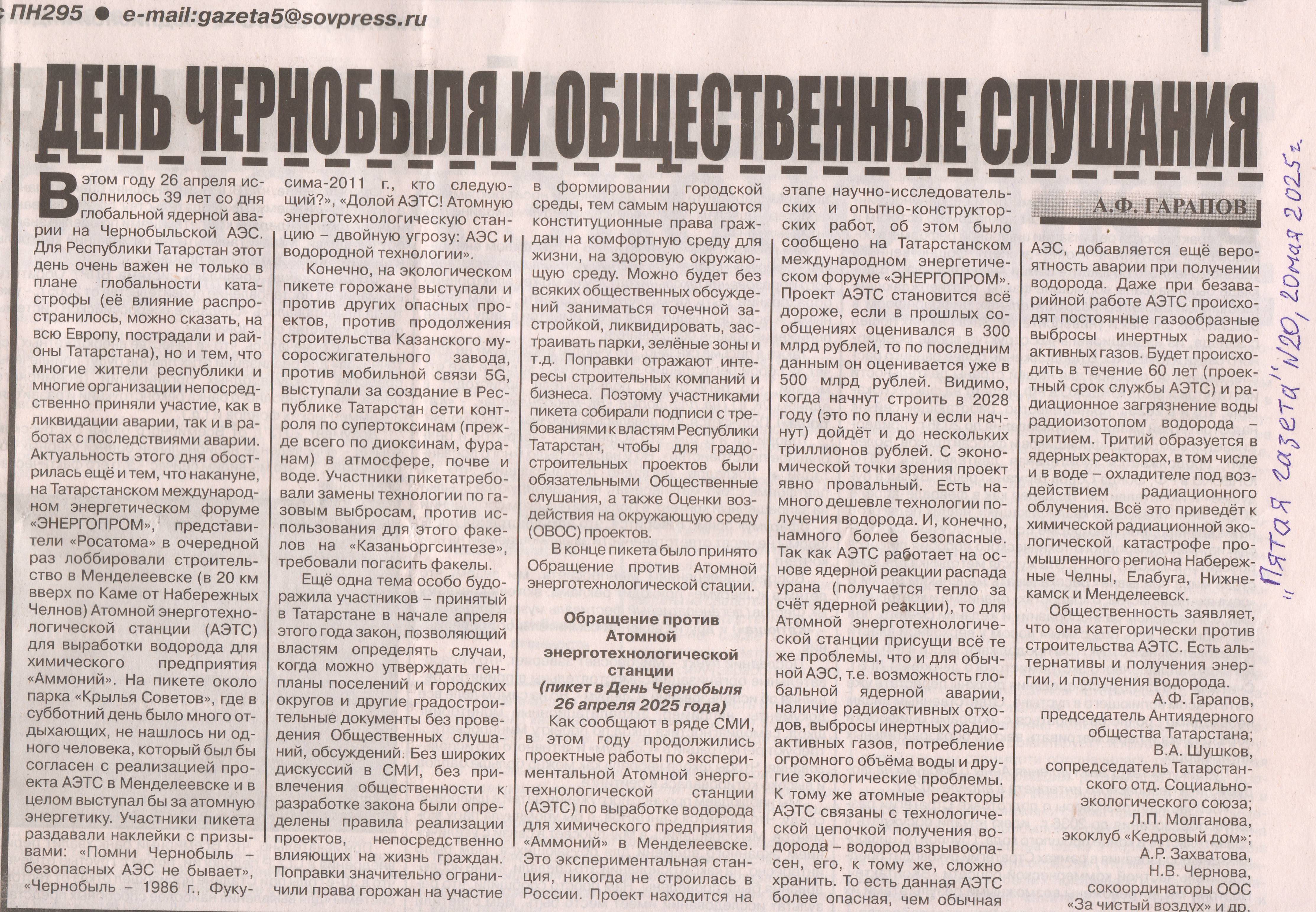 В прикрепленном файле статья «День Чернобыля и Общественные слушания» про пикет 26 апреля напечатанная в газете «Пятая газета» №20, 20 мая 2025г, издается в Москве.
