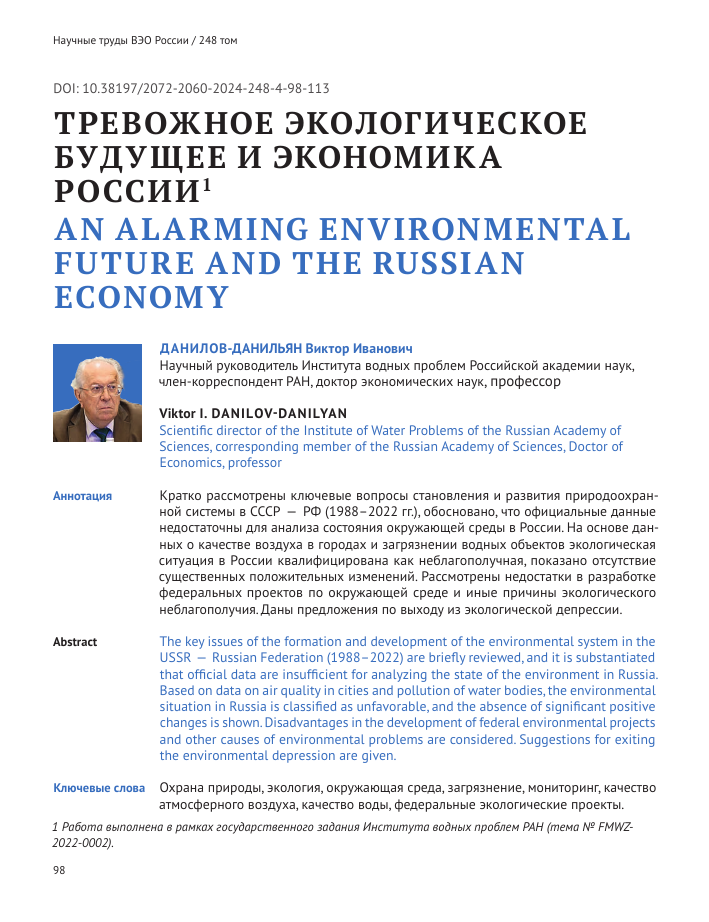 В.И. Данилов-Данильян. Тревожное экологическое будущее и экономика России
