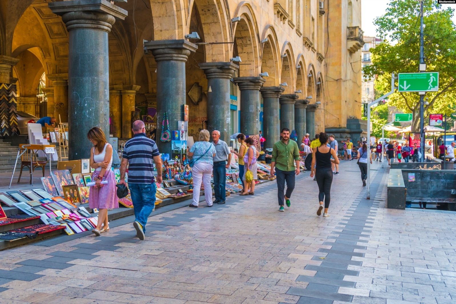 Мы спускаемся вниз. Крутые улочки с кирпичными домиками, колтунами спутанных проводов и винограда вокруг водостоков и торчащей арматуры вытряхивают нас на нарядную площадь. Тут сплошной модерн, торжественный и элегантный – кажется, что попали в другой город: слева Италия, справа Париж. Мы голодные, ищем грузинский ресторан, но попадаются одни турецкие. Свернув в боковую улицу, утыкаемся в мятые железные листы, прибитые к ветхому забору – Париж кончился так же неожиданно, как и начался.