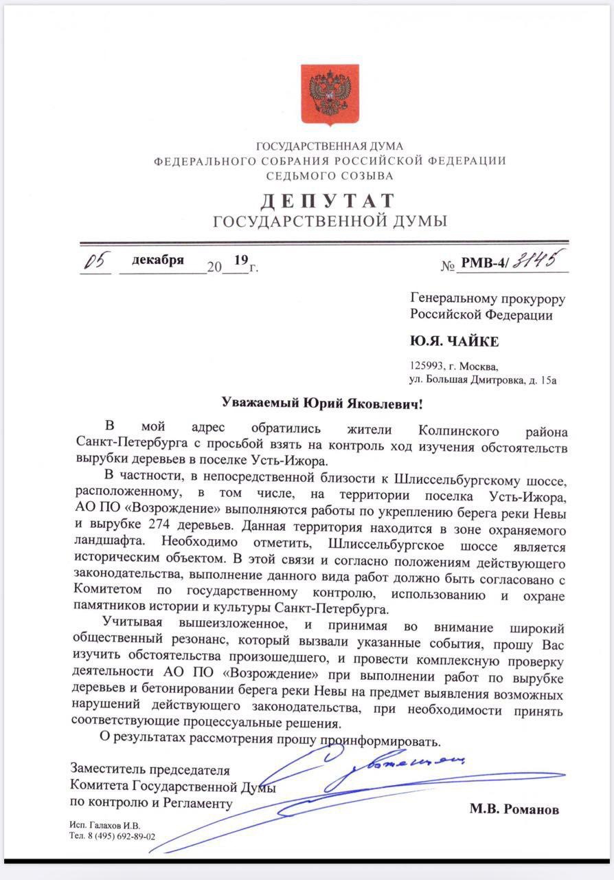 Subject: Депутат Госдумы обратился в генпрокуратуру по ситуации в Усть-Ижоре