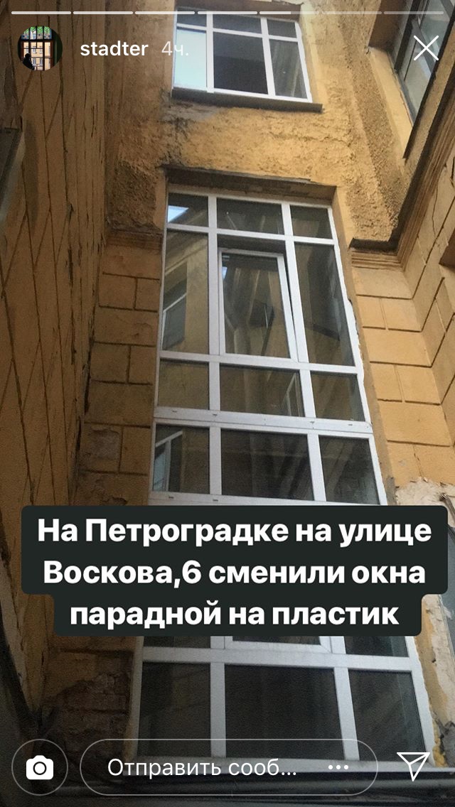 Деревянные окна, которые, как правило, не требовали тотальной замены, выбрасывают на улицу. В инстаграмм-аккаунтах любителей Петербурга то и дело звучат призывы забрать выброшенные на помойку рамы или хотя бы сохранить фурнитуру. По мнению краеведа Виктора Федотова, повторяется ситуация с заменой в 2000-е годы входных дверей парадных: сейчас об их замене жалеют и называют одной из главных утрат старого Петербурга.
