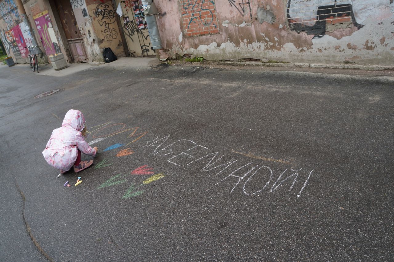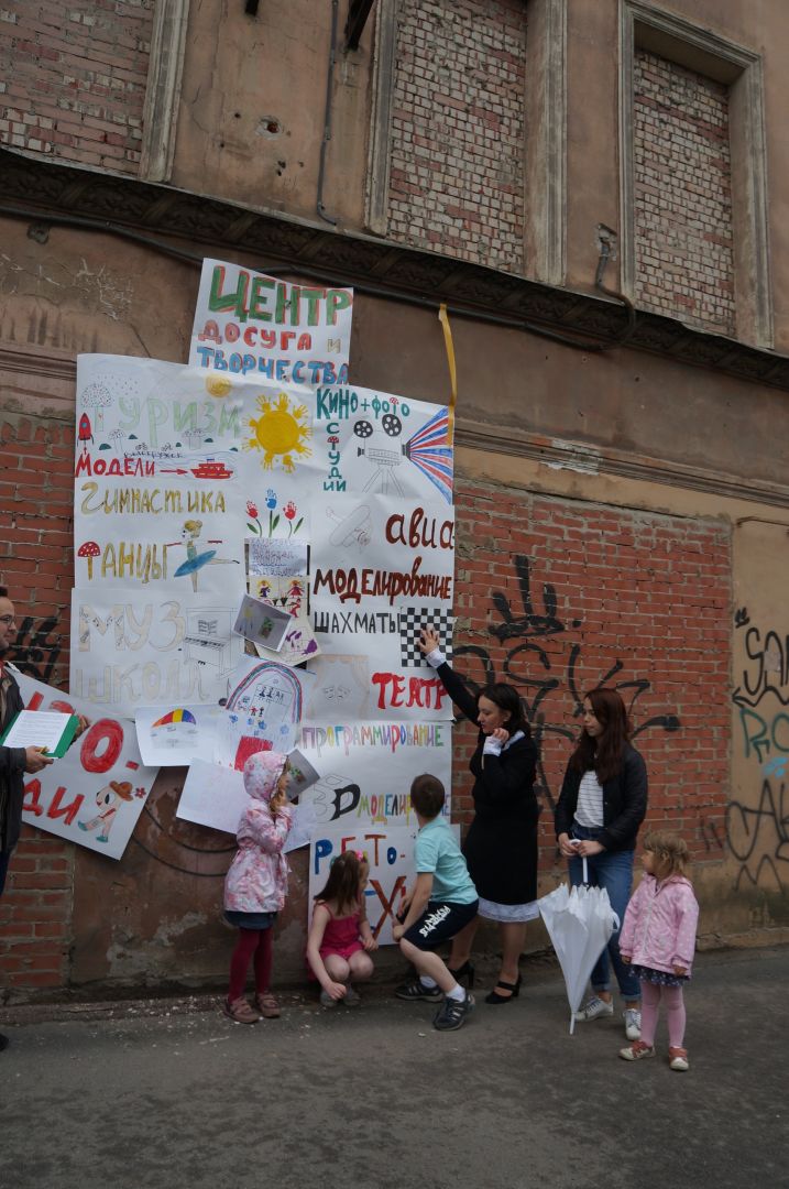 Вчера вечером у дома Забелиной рисовали, соревновались в эстафетах и украшали дом плакатами и рисунками. Юные жители окрестных кварталов и их родители считают, что в отреставрированном здании нужно разместить детский досуговый центр. Сейчас таких мест в районе не хватает, и детям приходится ездить на занятия за тридевять земель.