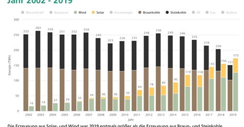 В 2019 году ветроэнергетика ФРГ впервые за всю историю выработала больше электричества, чем было произведено на основе бурого угля. Солнечная и ветровая энергетика впервые за всю историю совместно произвели больше, чем угольная генерация в целом (см. график).