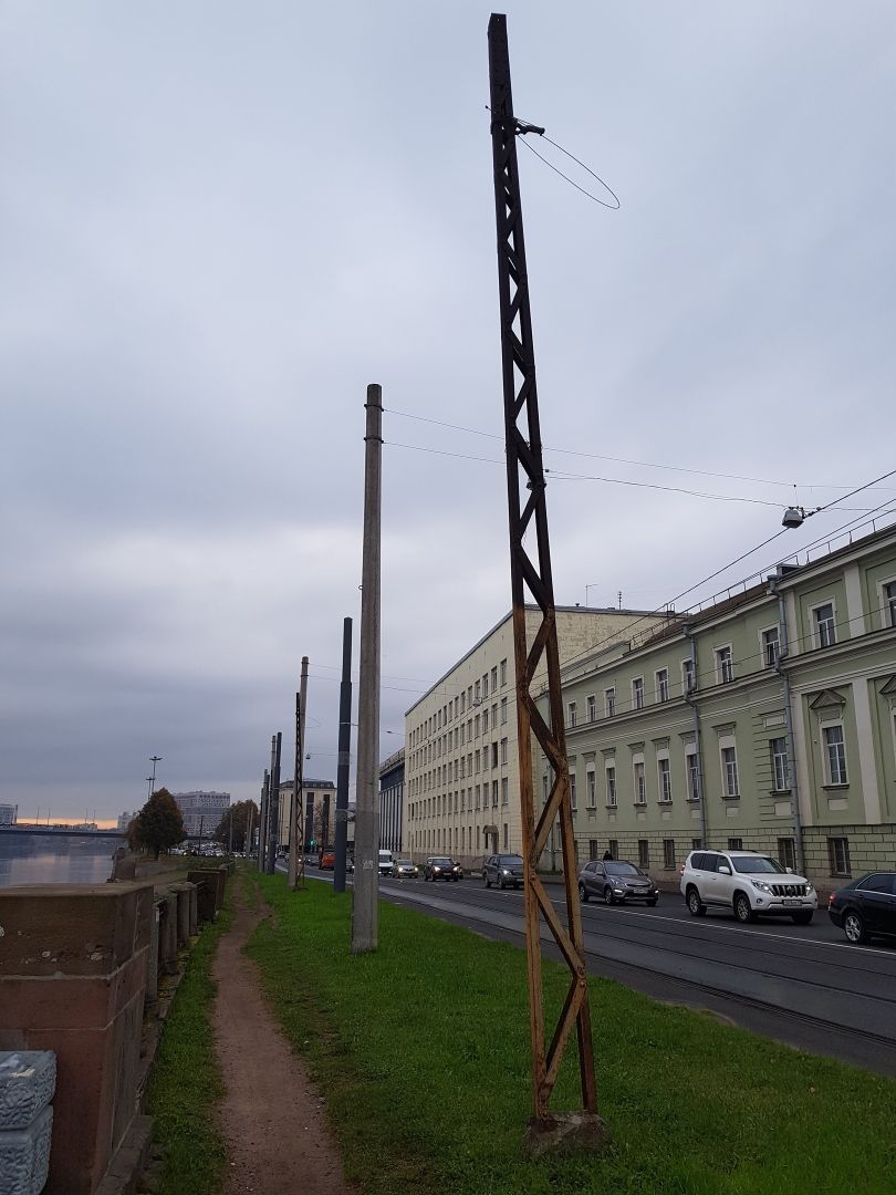 Опоры контактной сети городского трамвая на проспекте Обуховской Обороны, сохранившиеся на своём историческом месте с 1920-х гг., демонтируют. Металлические столбы срезают под основание, оставляя небольшие "пеньки".