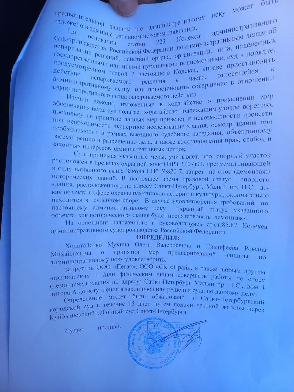 демонтаж на Малом пр. П.С., 4, до окончания судебных разбирательств.