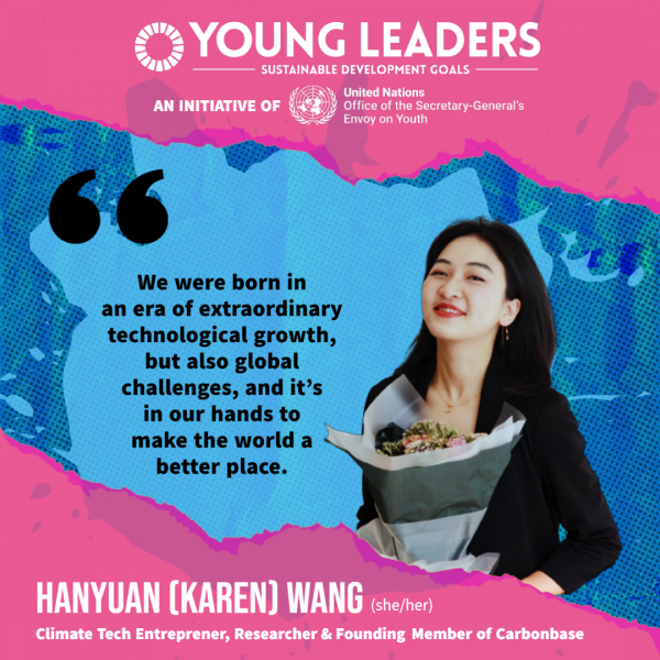 a.. Ханьюань (Карен) Ван из Китая. В 26 лет она стала известным предпринимателем в области климатических технологий. Ван - исследователь и член-основатель Carbonbase.