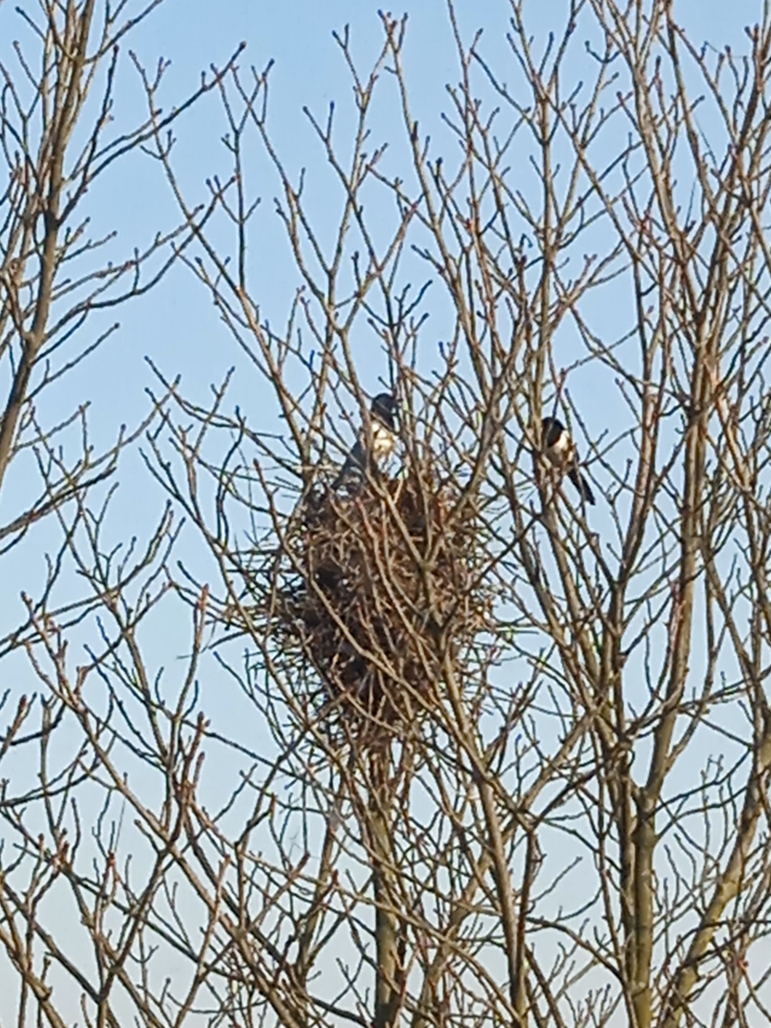 Сороки отстояли гнездо. Видно другой цвет новых веточек. Веселы. Вовсю