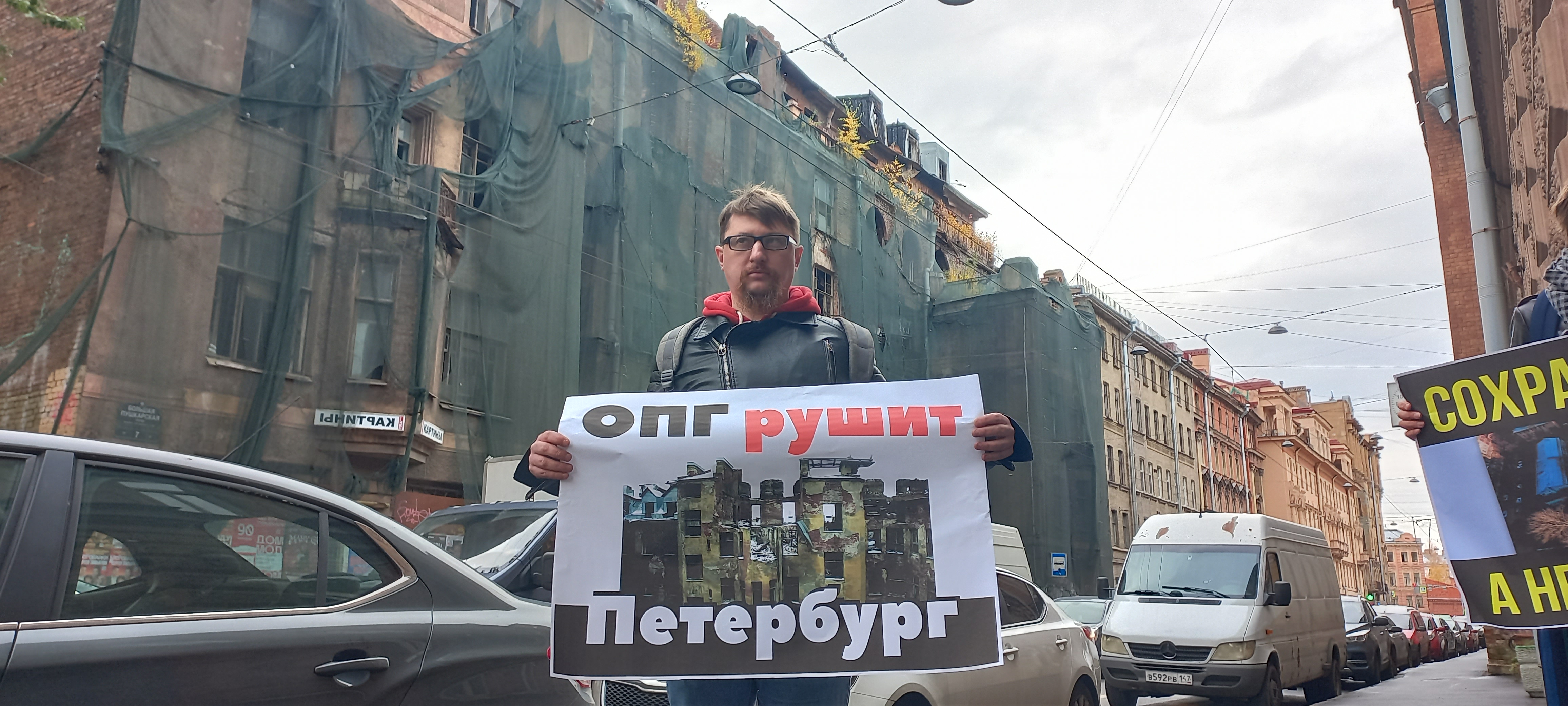 Олега Мухина обвиняют по “митинговой” статье за пикеты в защиту Дома Басевича. По версии полиции, они состоялись 14 октября “в составе группы лиц, состоящей из 4 человек, осуществлявших пикетирование…, целью которого было привлечение внимания окружающих к сохранению уникального архитектурного облика Санкт-Петербурга, а именно в поддержку Дома Басевича, совместно с: г-ном Мухиным Олегом Валерьевичем, держащим в руках плакат с надписью «ОПГ рушит Петербург!».