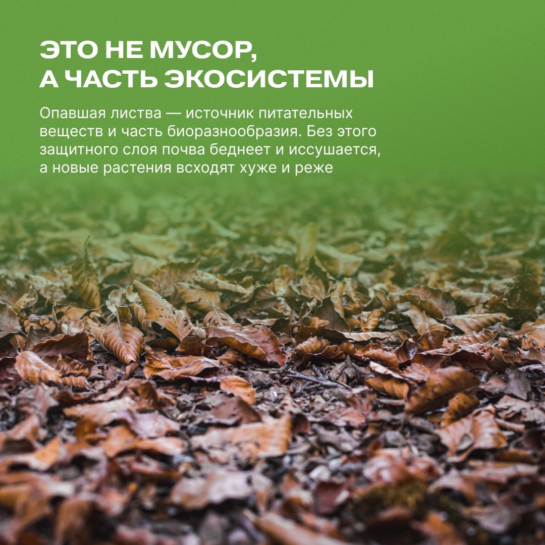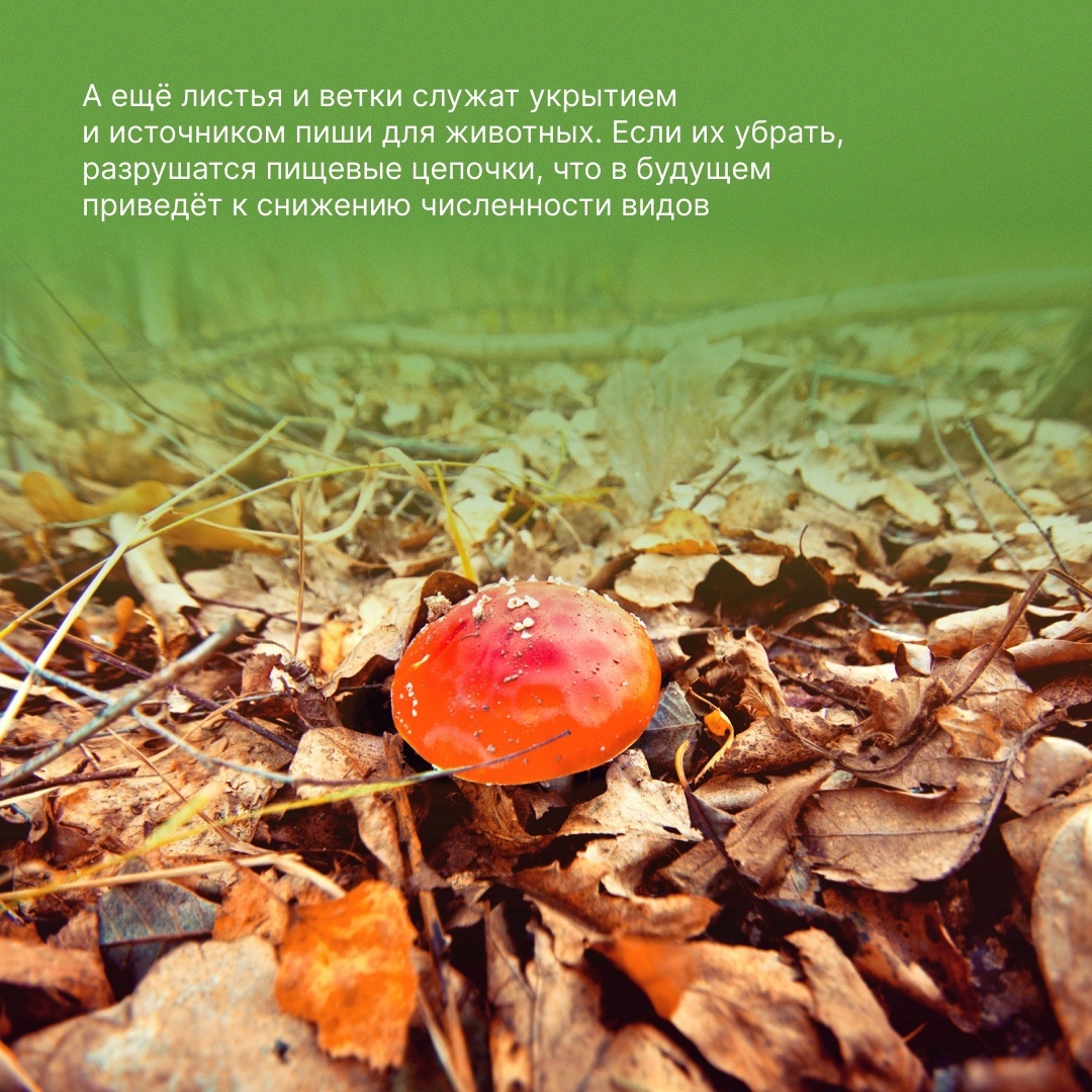 Отложи грабли! Опавшая листва и ветки — это ценный природный ресурс, поэтому избавляться от них не нужно. К чему может привести слишком тщательная уборка и где она действительно необходима — читай в карточках Движения Первых.