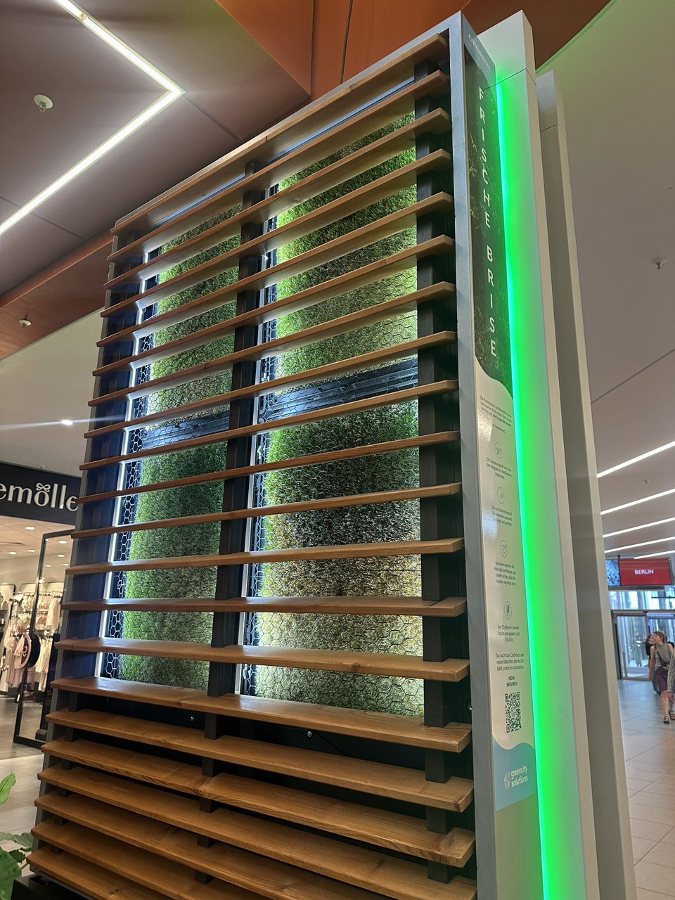 Возможно, вы уже видели такие зелёные конструкции из мха в торговых центрах - например, эти фотографии сделаны в East Side Mall. Это CityTree, разработка бранденбургского стартапа Green City Solutions. Биофильтрационная установка, покрытая живым мхом, очищает воздух от пыли и вредных частиц, связывает углекислый газ и одновременно снижает температуру вокруг.